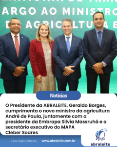 O presidente da ABRALEITE, Geraldo Borges, representou os produtores de leite na Cerimônia de Transmissão de Cargo do Ministério da Agricultura e Pecuária, realizada nesta quarta-feira (01/04), no auditório da Sede da Embrapa, em Brasília-DF. O evento marcou a posse do novo ministro André de Paula, que assume a pasta no lugar de Carlos Fávaro.A […]