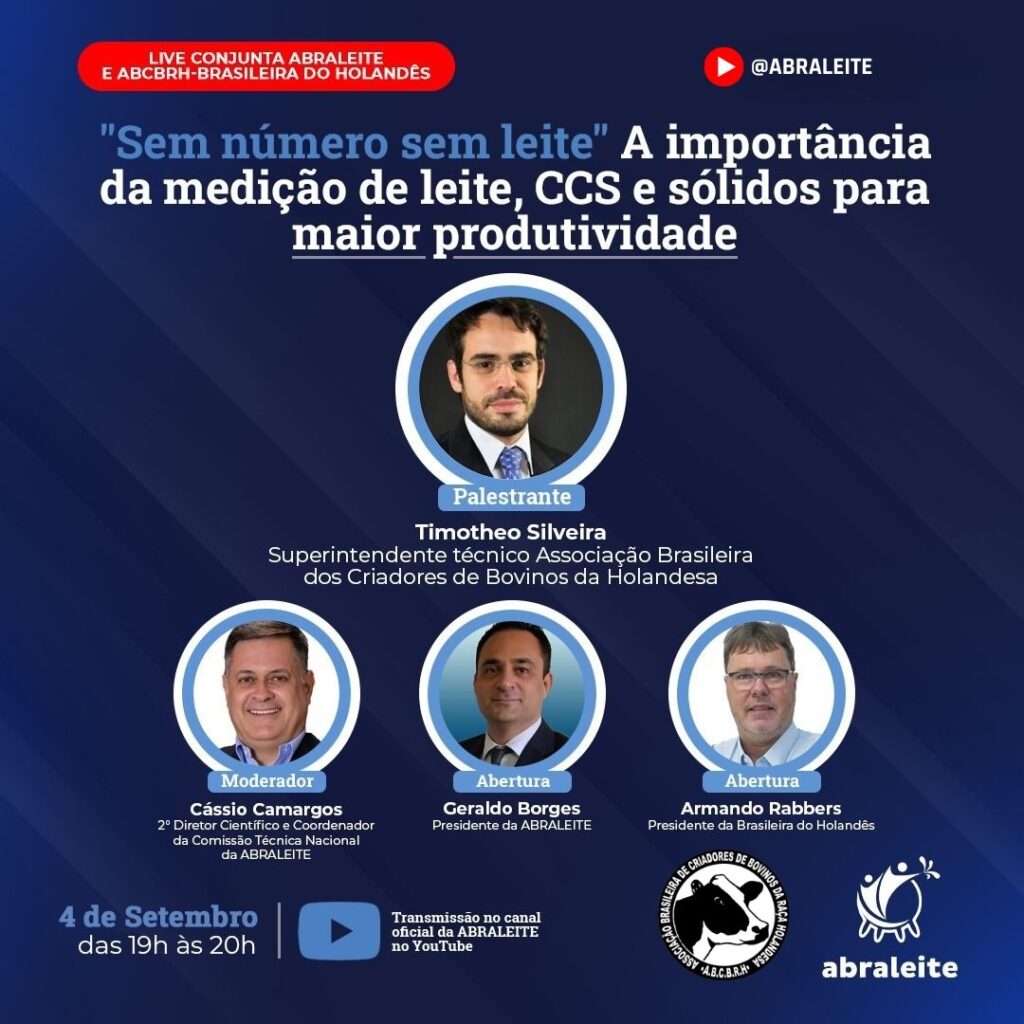 A ABRALEITE – Associação Brasileira dos Produtores de Leite e ABCBRH- Associação Brasileira Criadores Bovinos Raça Holandesa realizarão uma live em conjunto no dia 04 de setembro, das 19:00h as 20:00h. Com o tema “Sem número sem leite” A importância da medição de leite, CCS e sólidos para maior produtividade” a live terá como palestrante Timotheo Silveira- Superintendente técnico Associação Brasileira dos Criadores de Bovinos da Holandesa Moderador: Cássio Camargos 2° Diretor Científico e Coordenador da Comissão Técnica Nacional da ABRALEITE. Abertura: Geraldo Borges-Presidente da ABRALEITE. Armando Rabbers-Presidente da Brasileira do Holandês.