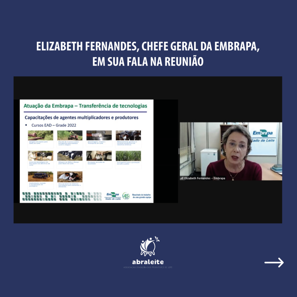 A nova chefe-geral da Embrapa Gado de Leite detalhou a estrutura e as prioridades da unidade em sua gestão, destacando a importância da aproximação com os diferentes players da cadeia produtiva, como a ABRALEITE. Elizabeth citou, inclusive, o avanço na instalação do Observatório do Leite Orgânico.
