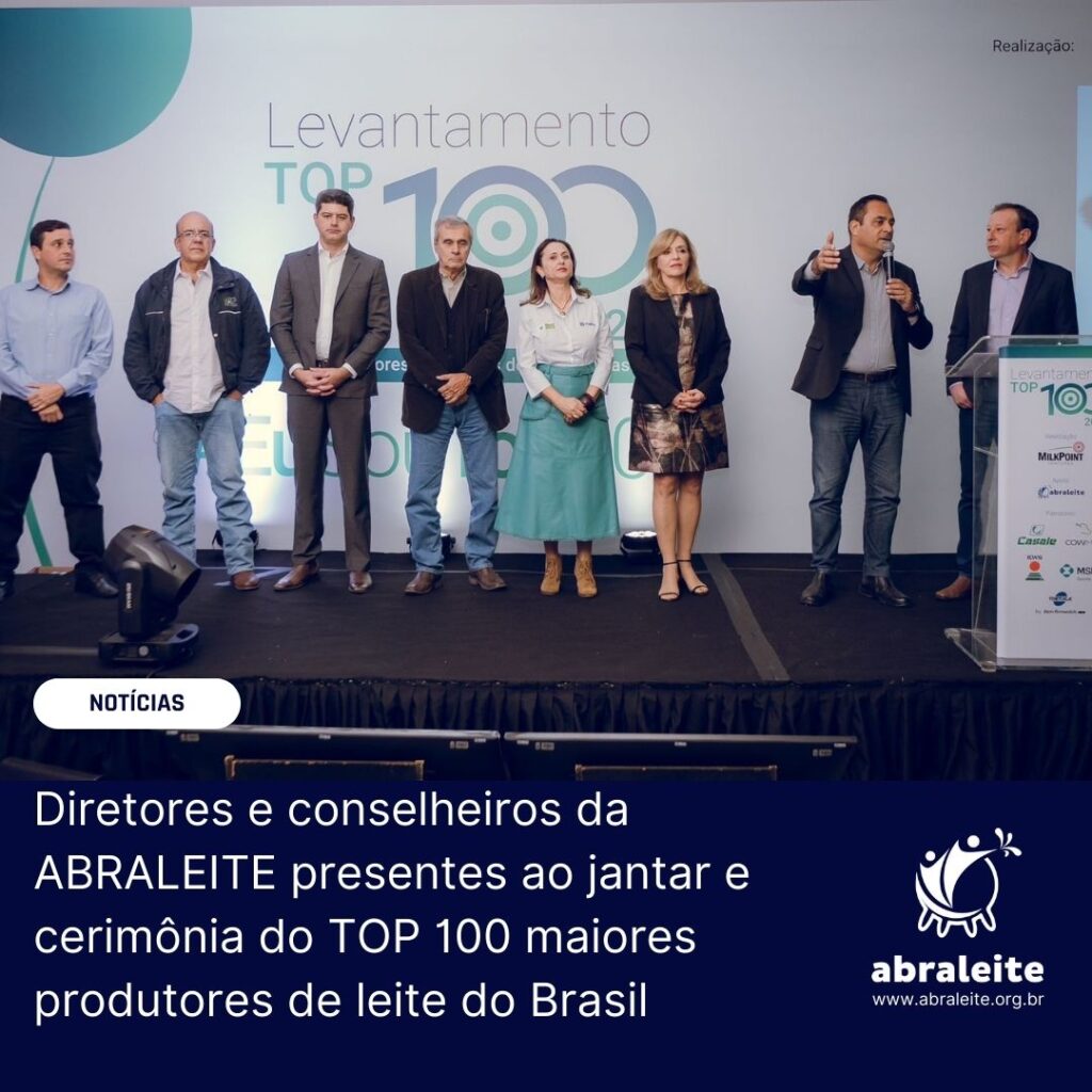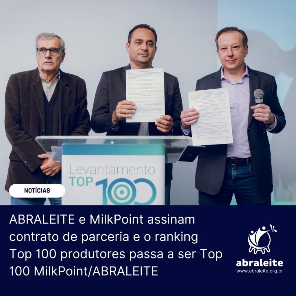 Durante o jantar de cerimônia do TOP 100 2024 dos maiores produtores de leite do país, realizado no dia 13 em Goiânia-GO, foi realizada a assinatura do contrato de parceria entre a ABRALEITE e a MilkPoint Ventures. A partir da edição de 2025, com dados de 2024, a elaboração e condução da pesquisa TOP 100 MilkPoint/ABRALEITE (novo nome), que identifica e destaca os maiores produtores de leite do Brasil, será realizada em conjunto pelas duas parceiras.
