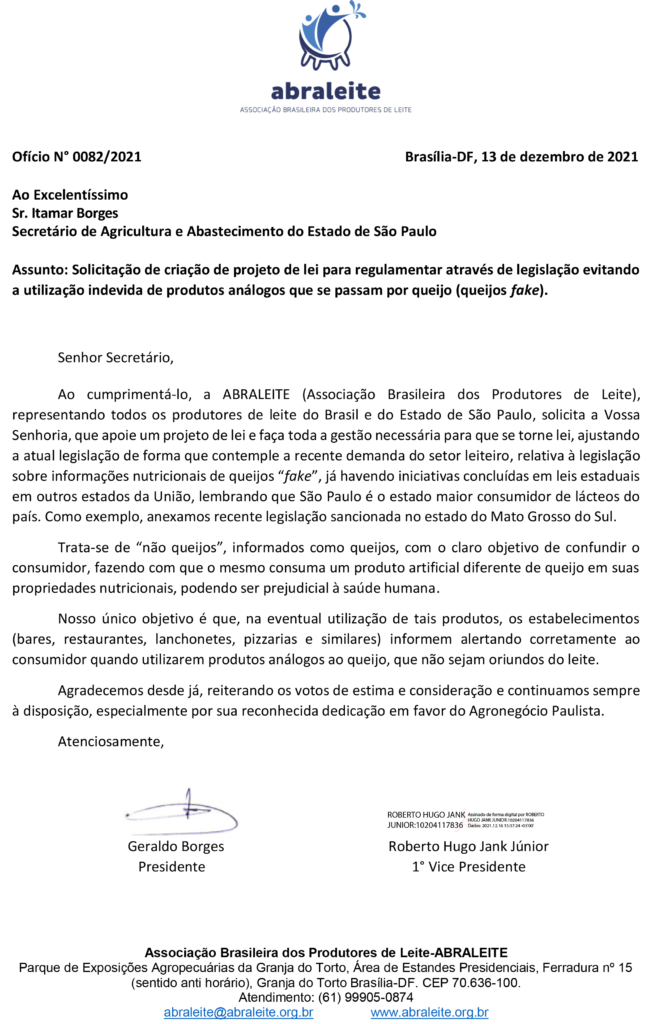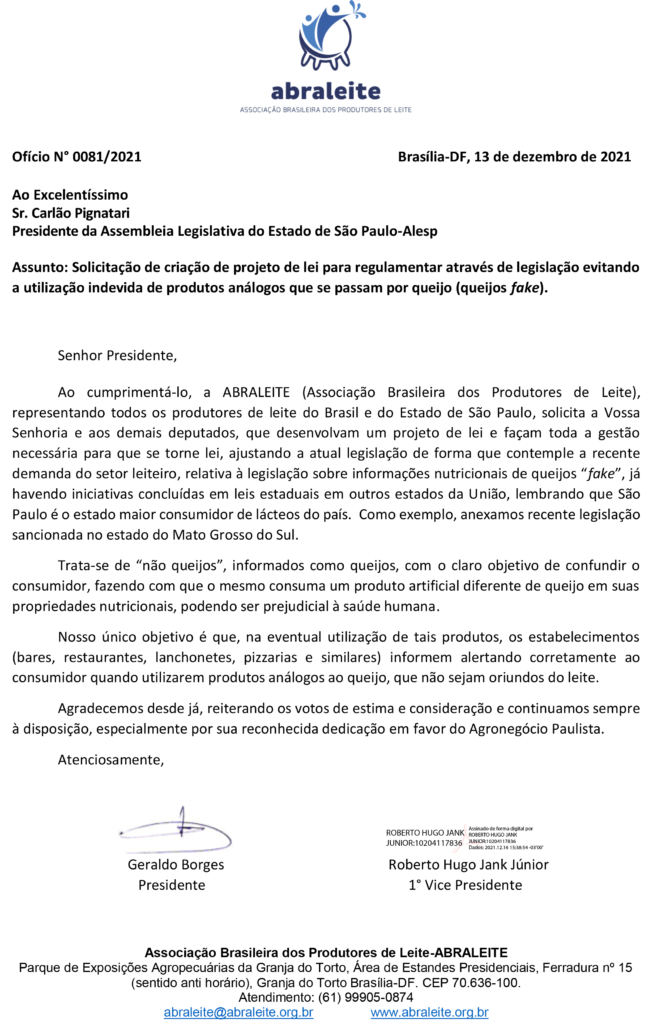 Ofícios da ABRALEITE ao Secretário de Agricultura e Abastecimento do Estado de São Paulo Itamar Borges e ao presidente da Assembleia Legislativa do estado Carlão Pignatari, assinados pelo presidente Geraldo Borges e pelo vice-presidente da Roberto Jank Jr, representam mais um passo da entidade para bem-informar os consumidores sobre os “queijos fake” ou “não-queijos” diferenciando-os dos queijos à base de leite.
