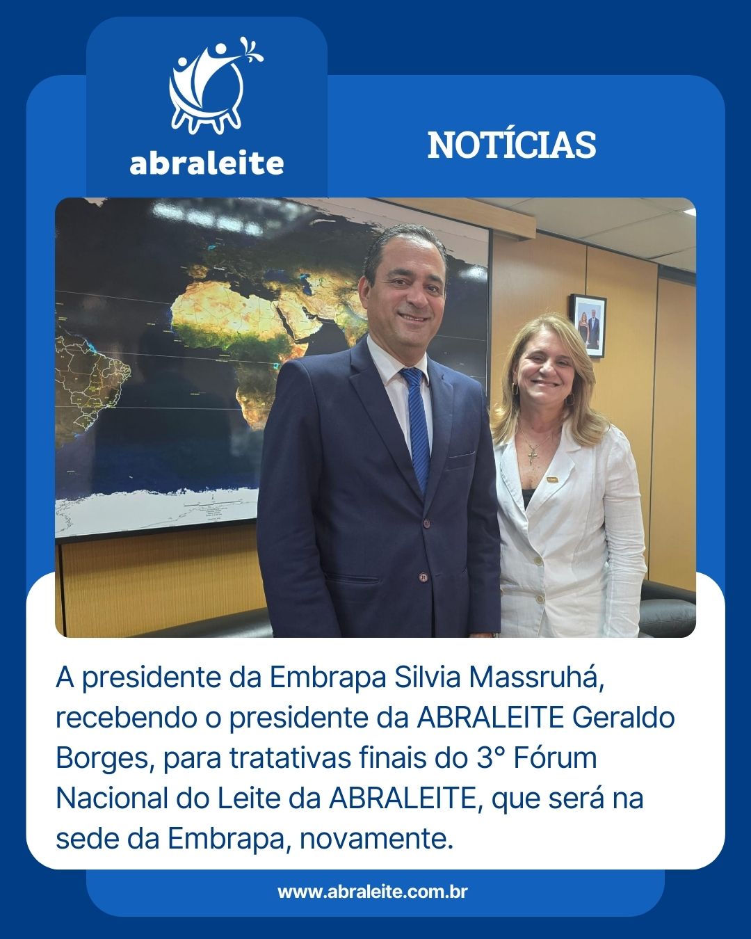 O presidente da ABRALEITE, Geraldo Borges, esteve no gabinete da presidente da Embrapa, Sylvia Massruhá, para alinhar os detalhes finais da organização do 3º Fórum Nacional do Leite da ABRALEITE.