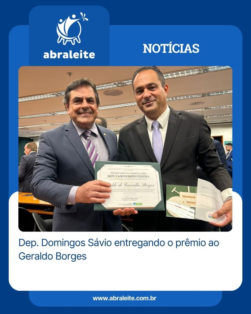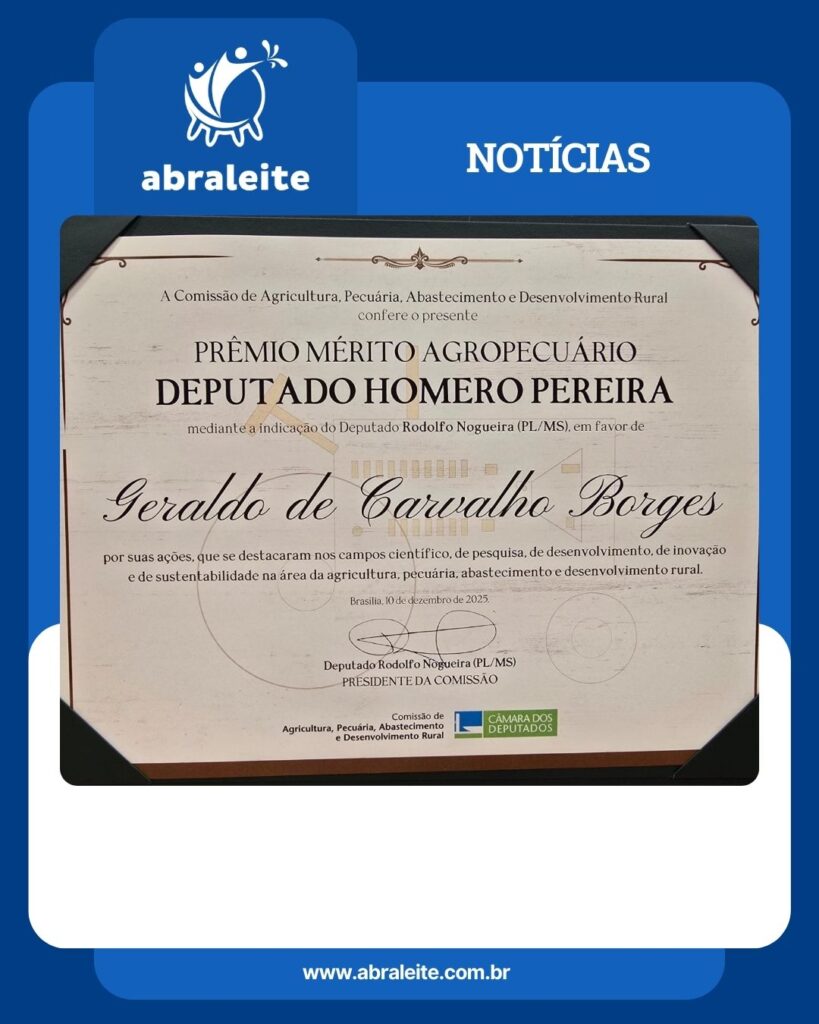 Geraldo Borges, presidente da ABRALEITE, foi homenageado nesta quarta-feira (10/12), com o Prêmio Mérito Agropecuário Deputado Homero Pereira, concedido pela Câmara dos Deputados em Brasília.