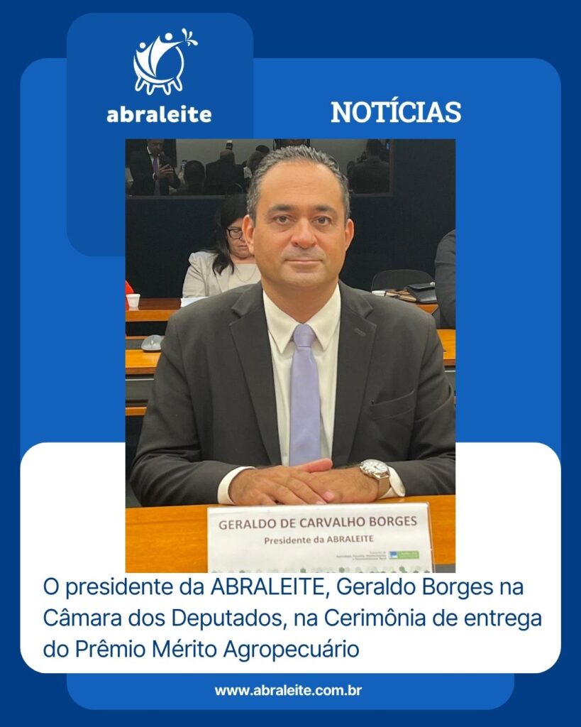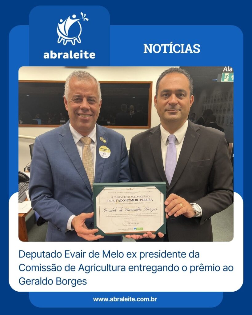 Durante a cerimônia o presidente da Comissão de Agricultura da Câmara destacou o trabalho do presidente da ABRALEITE Geraldo Borges, por seu compromisso com o setor agropecuário, sobretudo o leiteiro, com sua presença na Câmara e no Senado todas as semanas, trabalhando pautas importantes, participando de reuniões, audiências públicas e momentos importantes da construção de pautas legislativas projetos de lei e políticas públicas importantes para o setor leiteiro e o agro, contribuindo com o setor e com a nação brasileira.