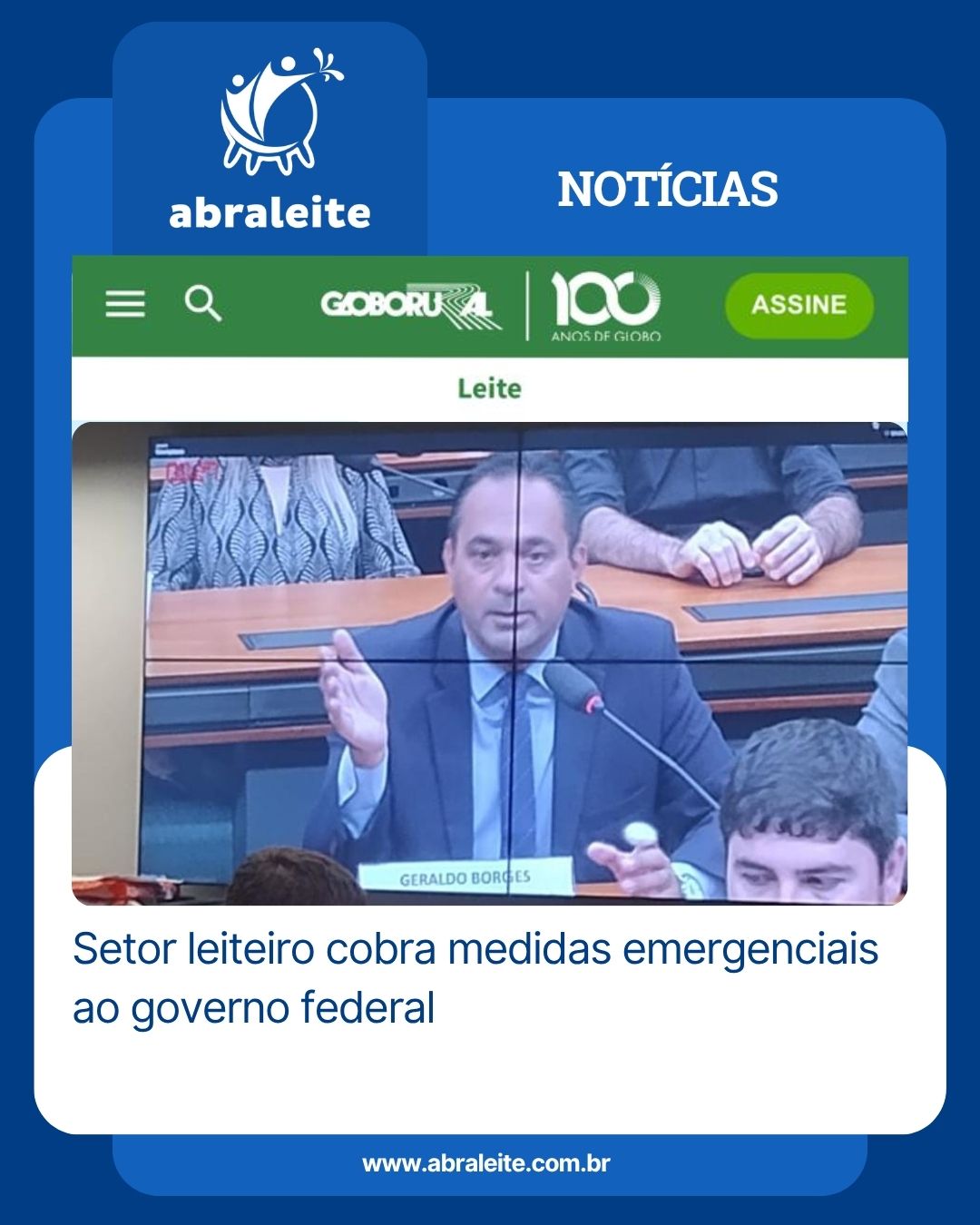 As palavras do presidente da ABRALEITE, Geraldo Borges, durante a audiência pública realizada em 04/11, promovida pela Comissão de Agricultura da Câmara dos Deputados, fizeram parte da matéria do Globo Rural, escrita pelo jornalista Rafael Walendorff.